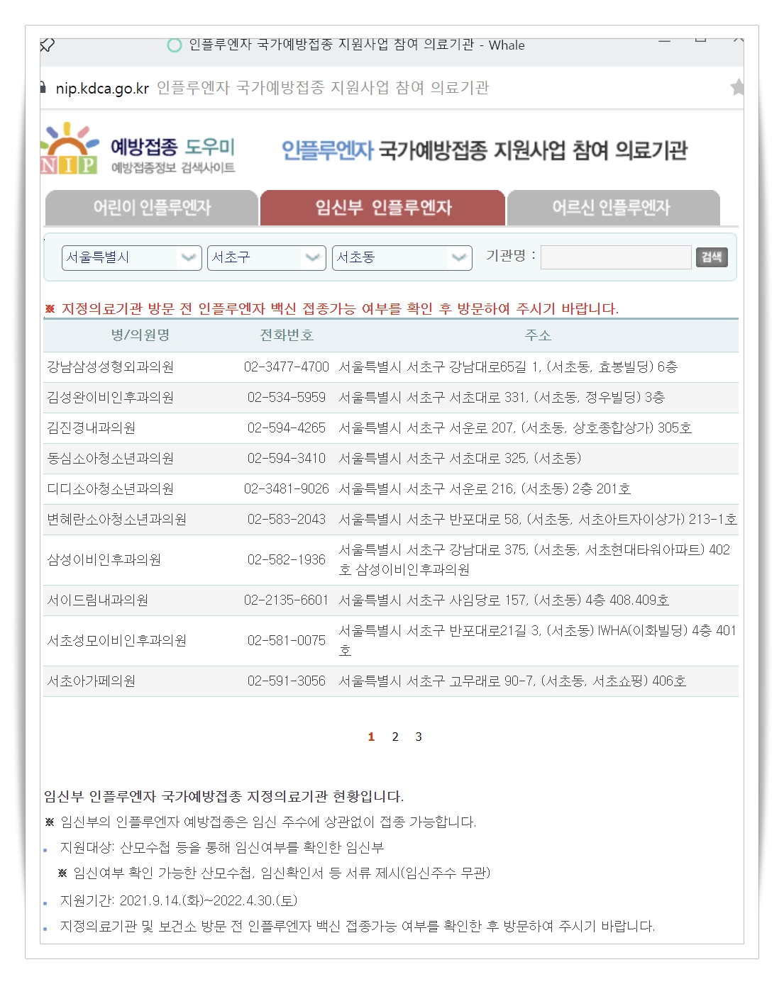 서울시 서초구 서초동을 검색했을때, 어린이 인플루엔자와 임신부 인플루엔자는 동일 병원으로 나오는데요. 어르신 인플루엔자는 병원 자체가 다른 병원들로 나옵니다. 이 점만 유의하시면 됩니다.