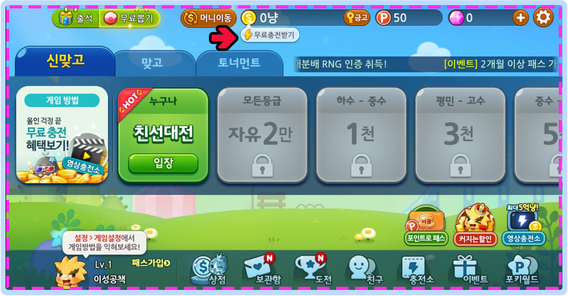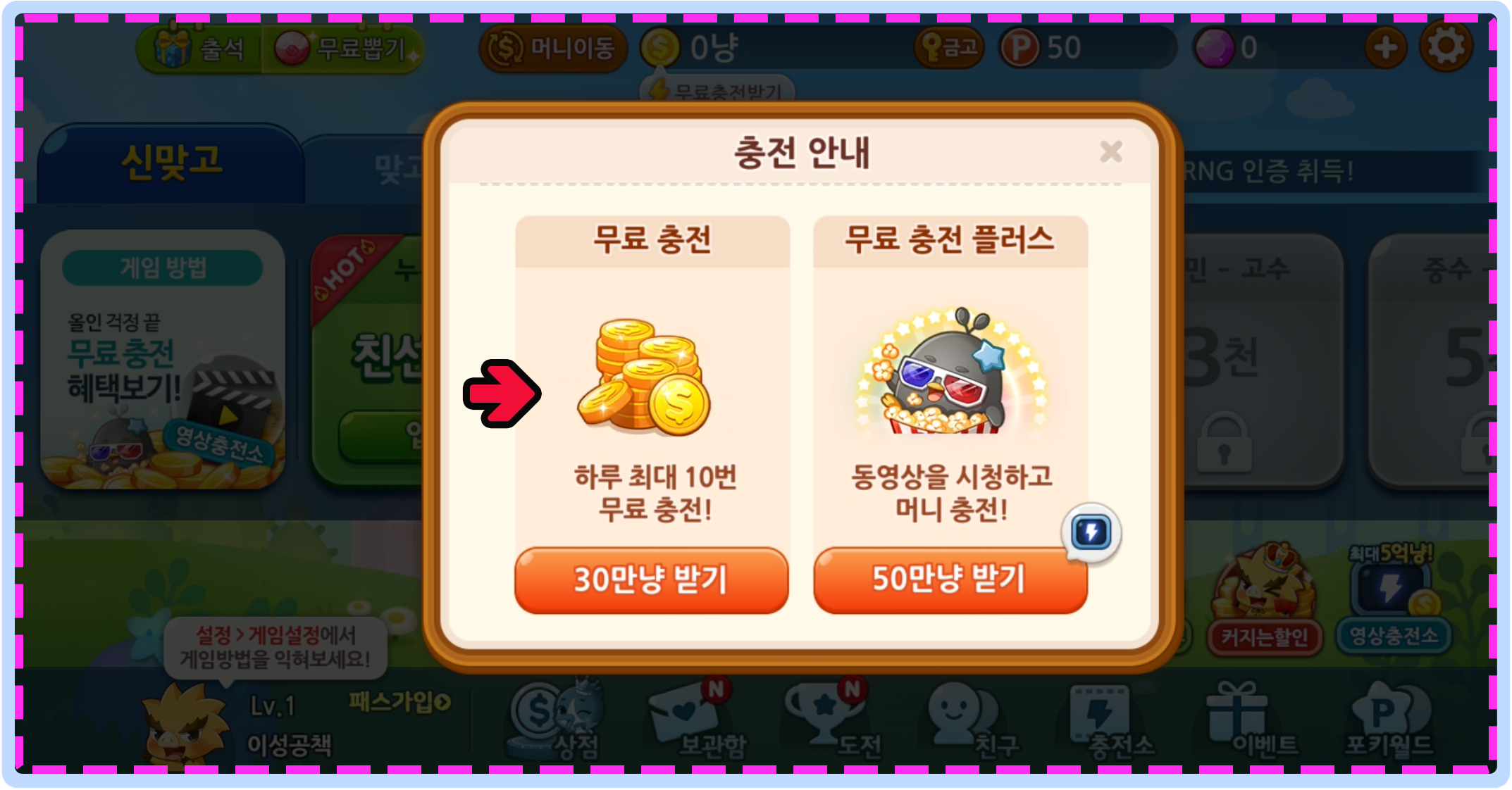 충전에 대해서 알려드리겠습니다. 무료 충전은 하루 10번 가능합니다. 30만 냥씩 10번이니까 300만 냥을 하루에 무료로 충전이 가능합니다. 동영상을 시청하고 머니를 충전할 수 있습니다. 그러니까 머니를 충전하기 위해서는 10번은 기본으로 되고, 플러스로 50만 냥까지 받을 수 있습니다. 350만 냥이면 하루 게임하기에 어렵지 않으실 겁니다.