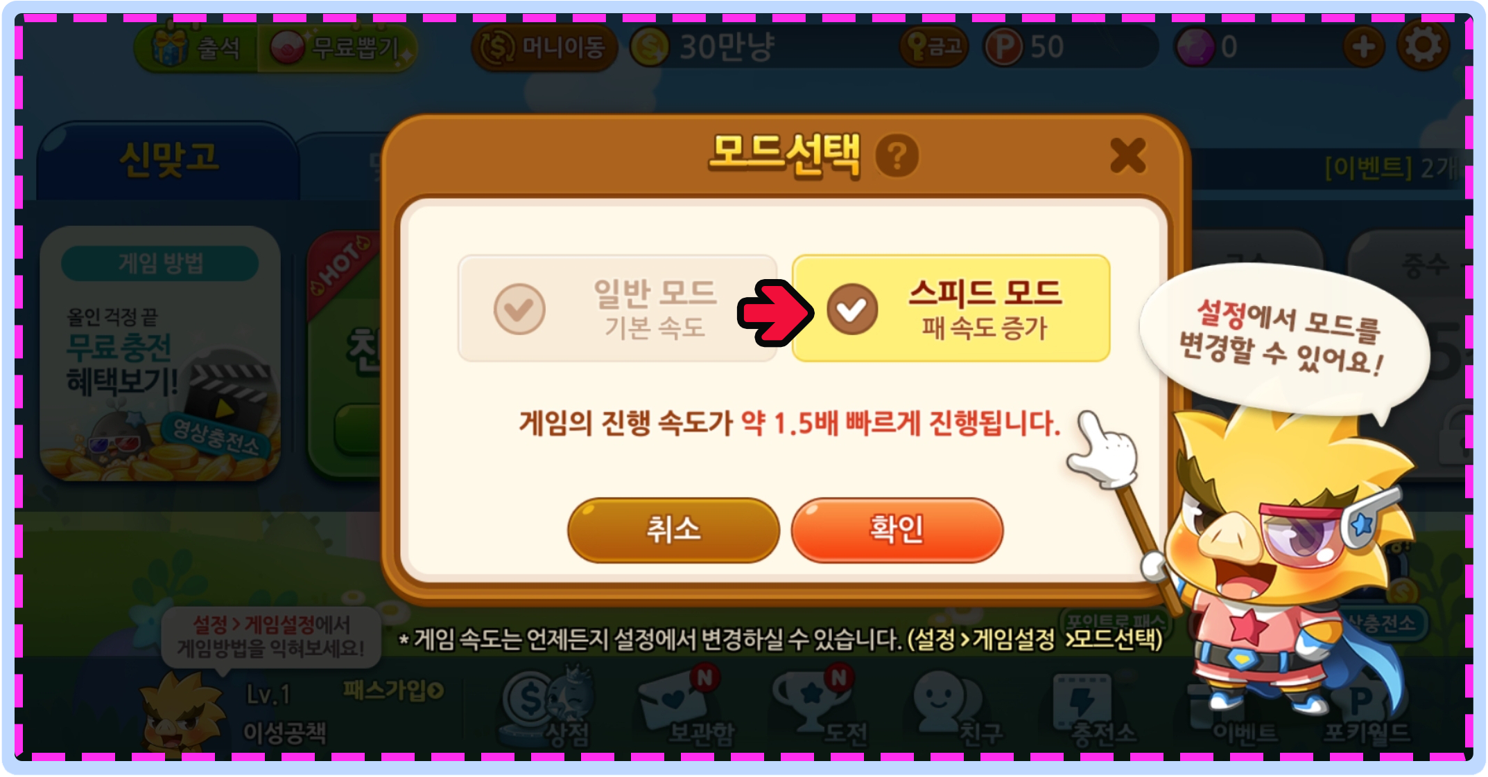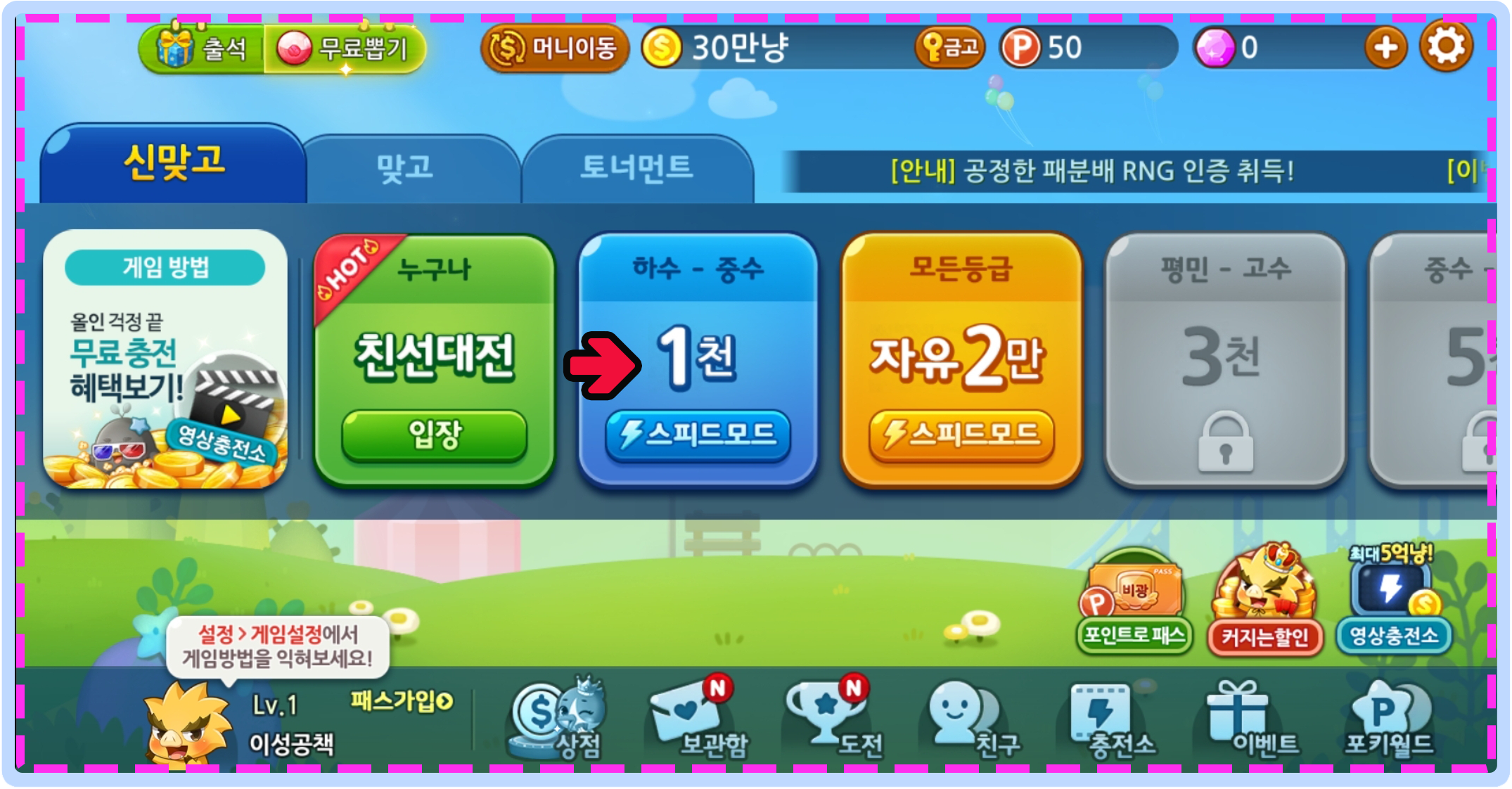30만 냥을 무료 충전했더니, 이제 하수-중수 방 1천 원 방과 모든 등급 자유 2만 등급으로 들어갈 수 있는 방비 오픈되었습니다. 처음이니까 1천 방으로 입장했더니, 모드를 일반 모드와 스피드 모드를 설정할 수 있는 팝업창이 나옵니다. 대부분 스피드 모드를 선택해서 게임을 합니다. 맞고의 묘미가 빠른 전개에 있습니다.
