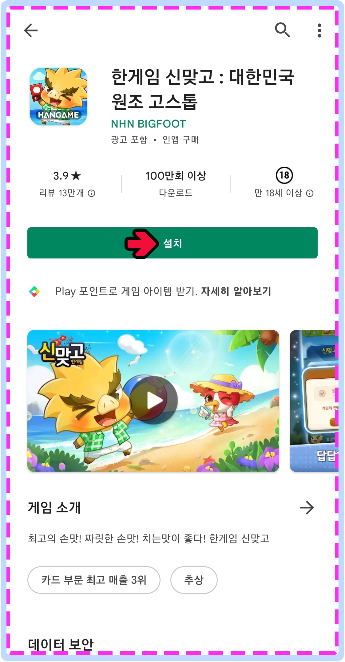 고스톱 중에서 가장 흥미진진하고, 점수도 많이 날 수 있고, 한 번에 올인을 당하기도 하는 종목은 바로 맞고입니다. 예전에 맞고였다면, 요즘은 신맞고가 새롭게 탄생했습니다. 피망 뉴맞고와 더불어 한게임 신맞고가 양대산맥으로 많은 사람들이 하고 있는 게임입니다. 지하철이나 버스로 이동할 때, 카페에서 누군가를 기다릴 때, 소파에 누워서 가만히 있을 때, 지루할 때, 심심할 때, 무료할 때 우리는 핸드폰을 봅니다. 너튜브를 보기도 하고, 인터넷을 뒤적거리기도 하고, SNS를 보기도 하고, 우리는 핸드폰과 이제는 뗄레야 뗄 수 없는 많은 시간들을 보내고 있습니다. 그럴 때 한게임 신맞고 핸드폰에서 설치해 놓으면, 아주 재미있는 시간을 보낼 수 있습니다. 핸드폰에 한게임 신맞고 설치하는 방법 지금부터 시작해 보겠습니다.