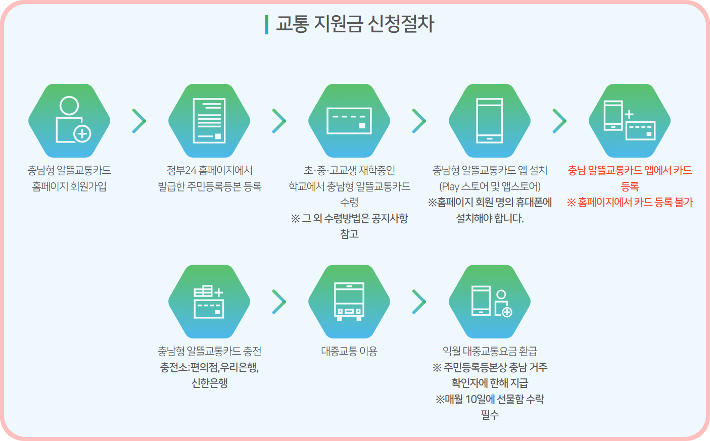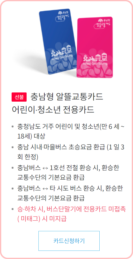4) 반드시 충남형 알뜰교통카드를 사용해야 합니다. 다른 알뜰 교통카드로는 지원이 불가능합니다.