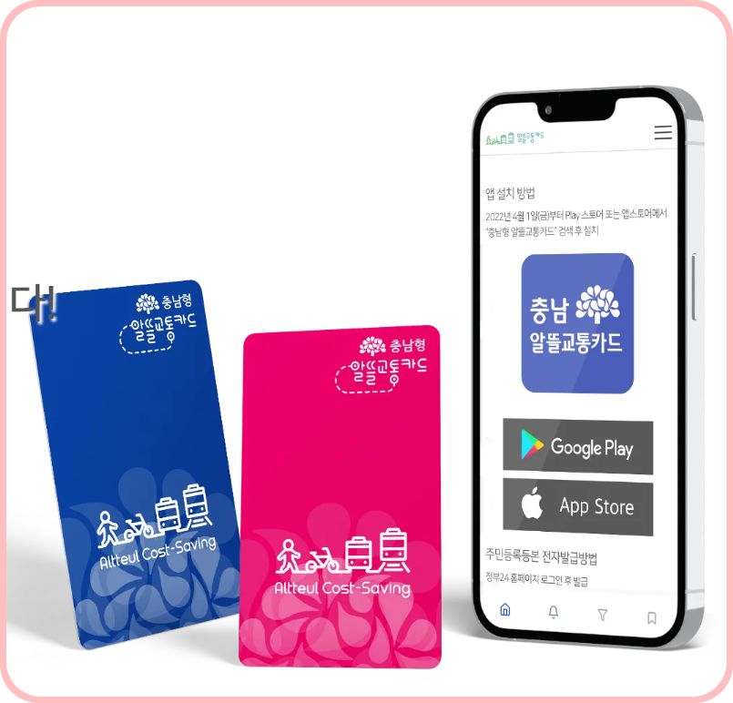가장 먼저 충남형 알뜰교통카드 홈페이지 회원가입을 해야 합니다. ( 바로가기 ) 회원가입 시, 정부 24 홈페이지에서 발급한 주민등록 등본이 필요합니다. (다른 곳에서 발급 받은 주민등록 등본을 사진으로 제출 할 수 없습니다.) 그렇게 회원가입을 마치면, 초, 중, 고등학생은 학교에서 충남형 알뜰교통카드를 발급 받을 수 있습니다. 미취학 아동의 경우 집으로 우편으로 발송이 됩니다. 여기서 끝나는 것이 아니고, 다음으로 충남형 알뜰교통카드 앱을 자신의 핸드폰에 설치해야 합니다. (홈페이지 회원 명의 휴대폰에 설치해야 합니다.) 다 자녀 가정의 경우, 자녀별로 카드 각각 등록해야 합니다. 앱에서도 카드 및 자녀 정보를 각각 등록해야 합니다. 앱 설치 바로가기는 아래에서 따라가시면 됩니다.