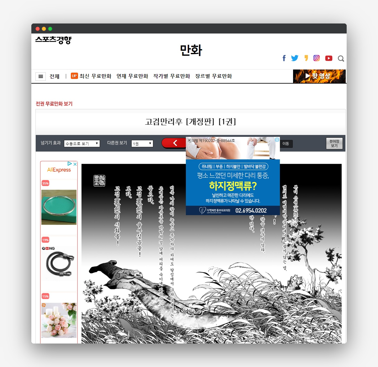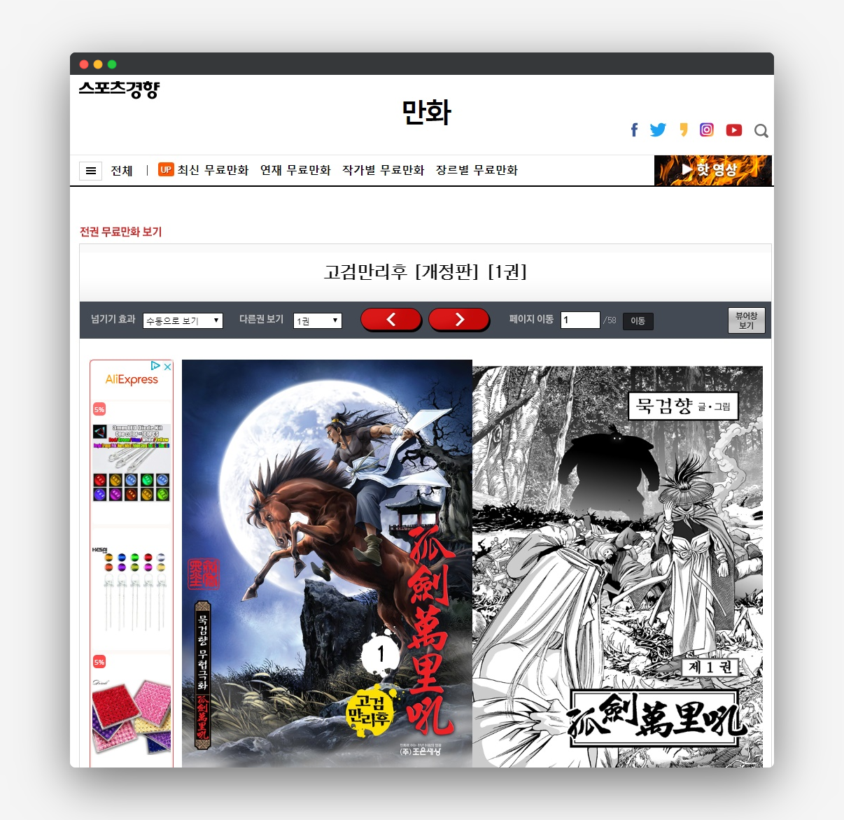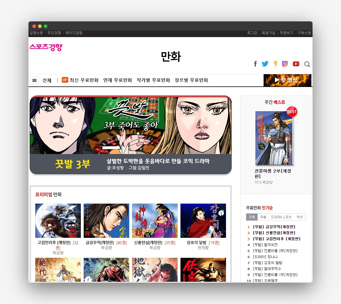 2020년 완전 무료 만화 사이트 다섯 번째는 스포츠조선 만화 카테고리입니다. 역시나 스포츠 신문들이 가장 많은 무료 서비스를 제공하고 있습니다. 여기에도 무협만화가 많이 존재하는데요. 거기에다 고행석 님의 전권 무료만화를 즐기실수 있습니다. 구영탄 혹시 아시나요? 고행석님의 주인공인데요. 예전 고행석에서 지금은 쌈마이까지 갈수록 진화화는 만화입니다.