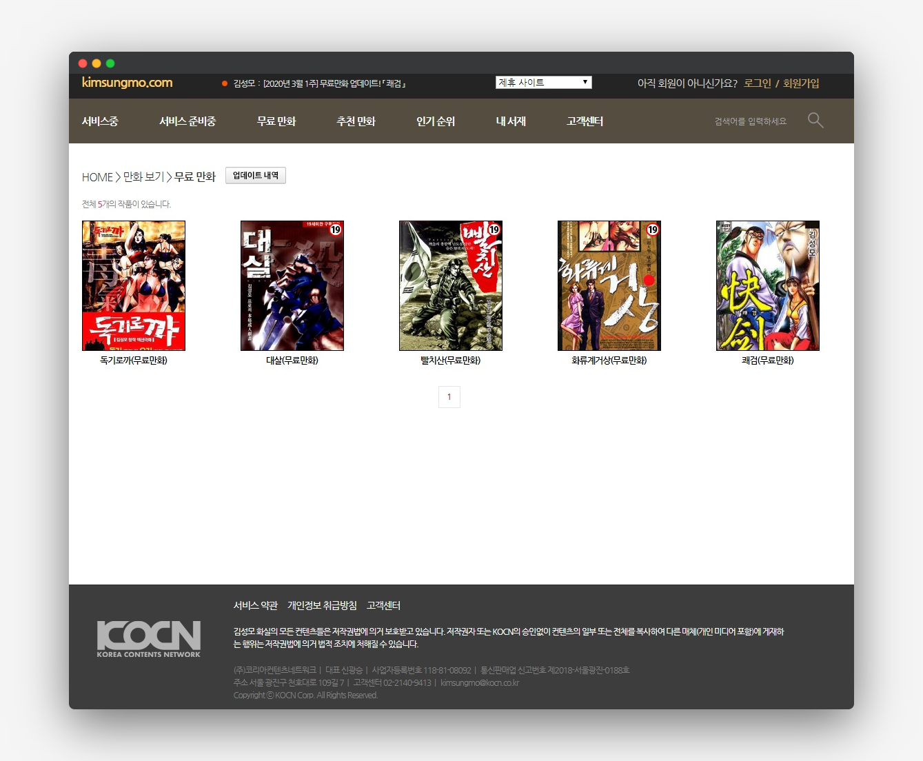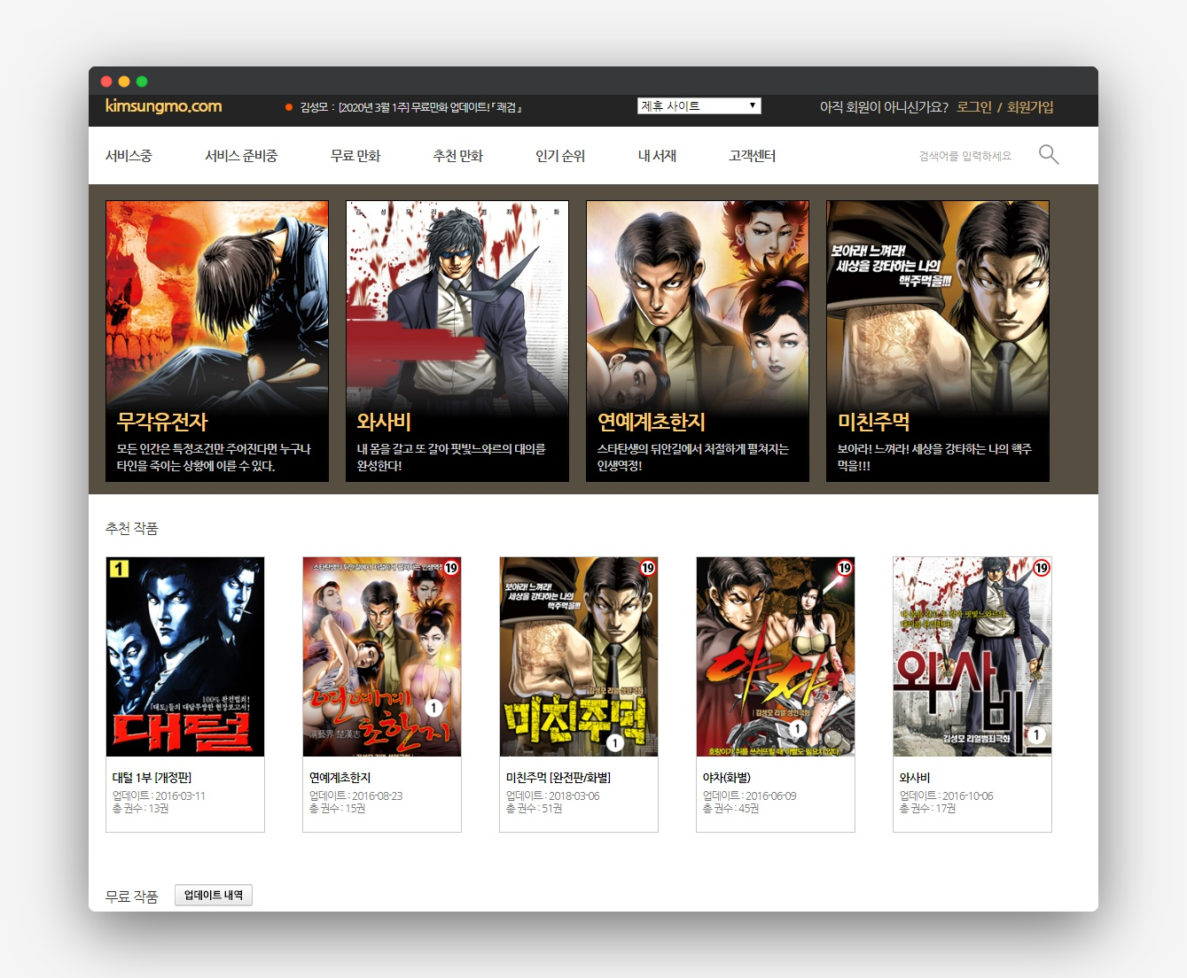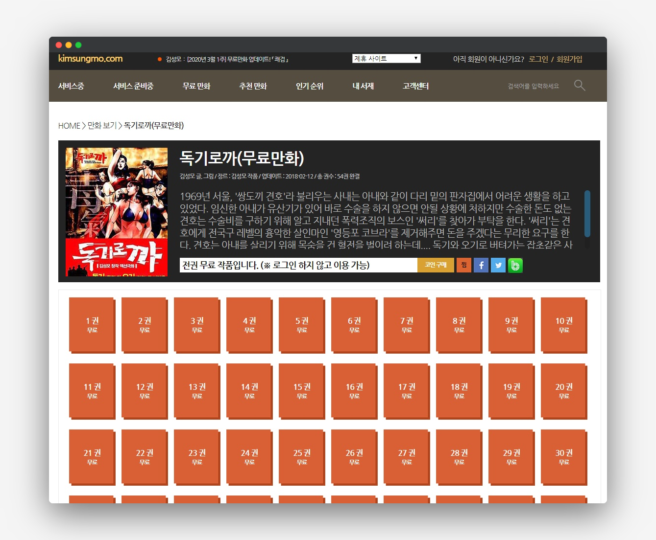 세 번째 사이트는 김성모 닷컴입니다. 대털을 시작으로 연예계 초한지, 그리고 무각유전자까지 끊임없이 새로운 장르에 도전하는 김성모 만화입니다. 일반 만화도 있고, 성인만화도 존재하는데요. 여기에도 무료만화 카테고리가 존재합니다. 물론 회원가입 없이 보기가 가능합니다.