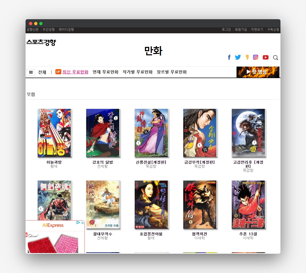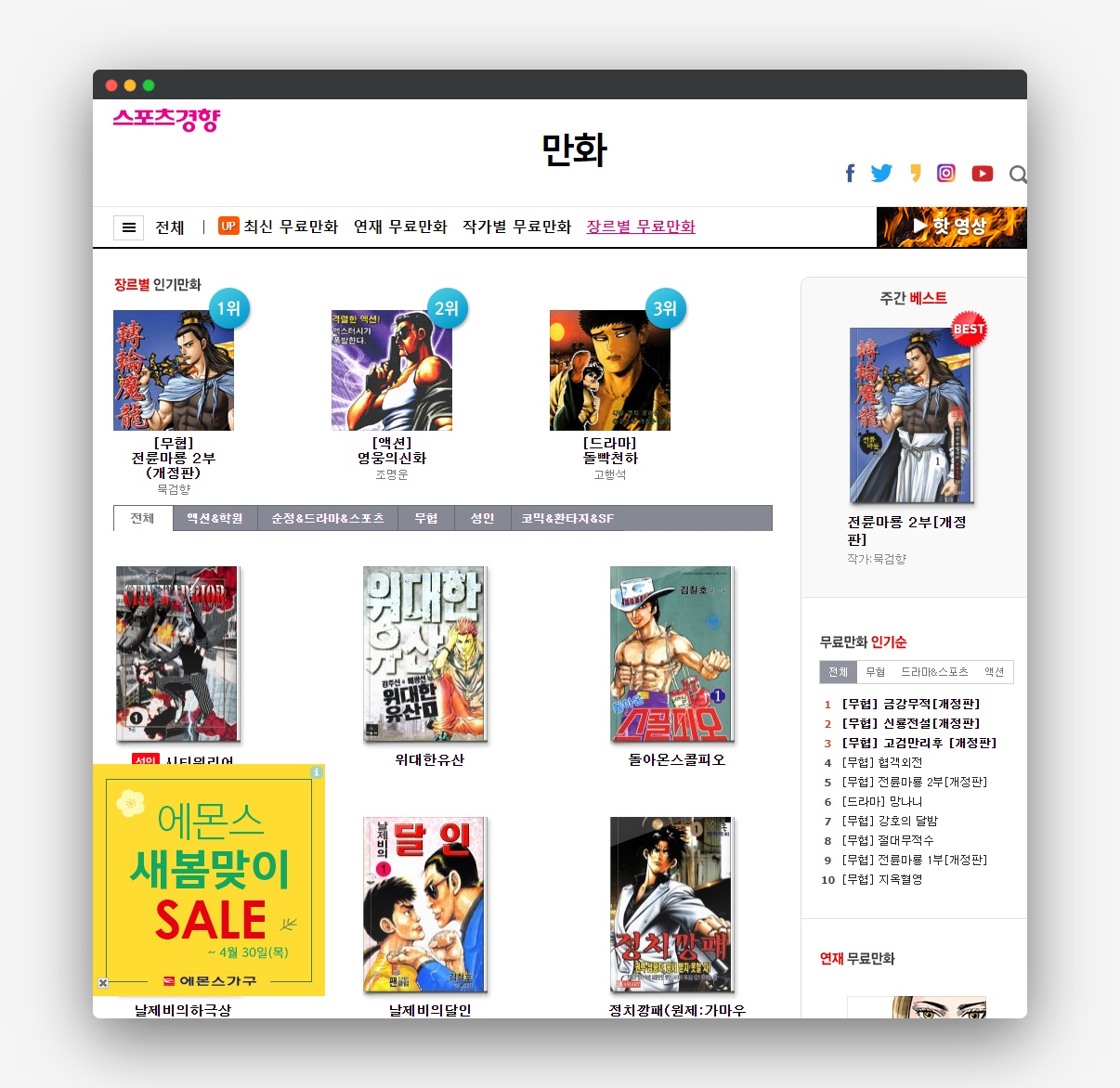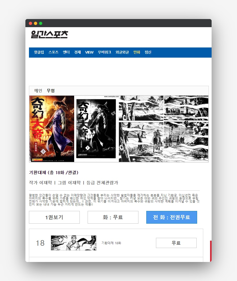 두 번째 완전 무료만화 사이트는 일간스포츠 만화 카테고리입니다. 여기는 그렇게 많은 그림책이 존재하지는 않지만 그래도 무료가 맞습니다. 이재학, 천제황 그림책들이 많이 있습니다.
